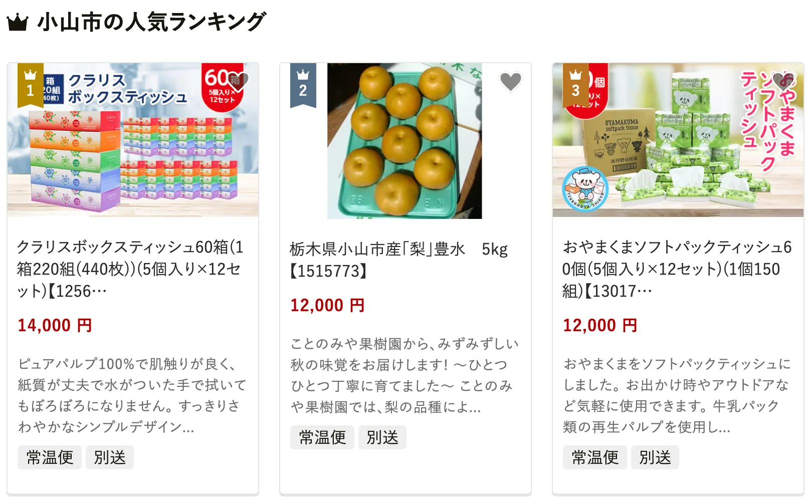 小山市で人気の返礼品は、「クラリスボックスティッシュ60箱」です。