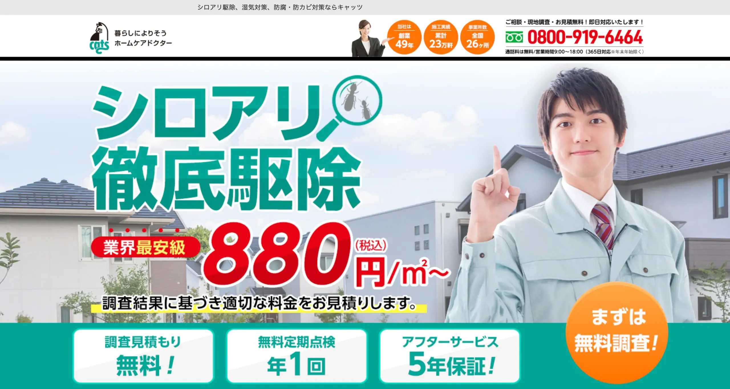 シロアリ駆除のキャッツは、1975年創業のシロアリ駆除・湿気対策を行う業者です。