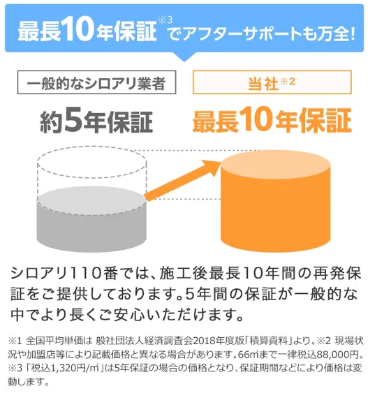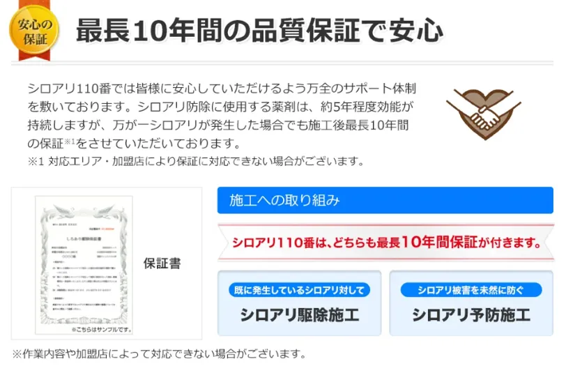 シロアリ駆除の保証期間は5年間が一般的ですが、シロアリ110番は最長10年保証が魅力的な特徴です。