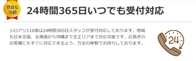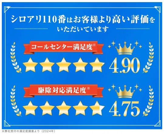 全国対応のシロアリ駆除サービス「シロアリ110番」は、24時間365日対応可能で、急なトラブルにもスピーディーに対応できるのが特徴です。
