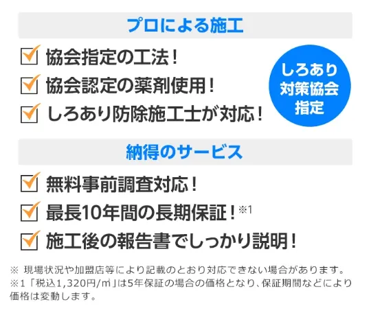 シロアリ110番は料金の安さだけでなく、無料の現地調査や最長10年の長期保証など